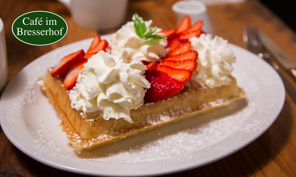 Genieße eine herrliche Waffelspezialität nach Wahl im Café im Bresserhof: Du hast die Wahl zwischen der Waffel Spezial, Goldstück oder Pflaumentraum
