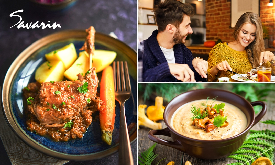 Geniet van een zalig 4-gangen wilddiner of -lunch bij Brasserie Savarin: met bij het hoofdgerecht everzwijnragout of konijn op grootmoeders wijze