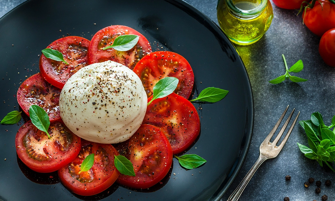 met burrata, gegrilde paprika, zoetzure ui, noten en basilicumdip