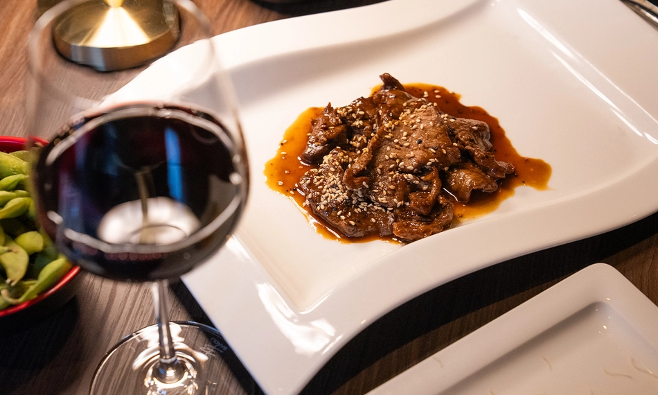 met Black Angus beef, rode ui en ponzusaus