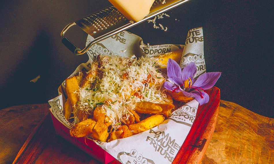 keuze uit standaard classic friet, knoflookfriet (+ €0,50) en zoete-aardappelfriet (+ €1,50)