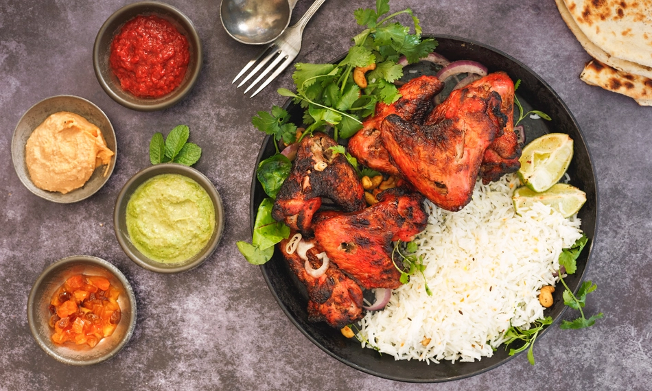 filet de saumon mariné, épices, beignets à la farine de pois chiches - Poulet tandoori