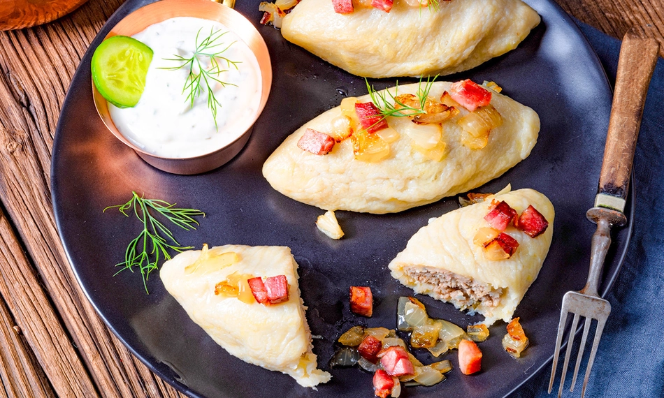 traditionele Litouwse aardappelknoedels gevuld met gekruid varkensgehakt, geserveerd met spek-uienmix