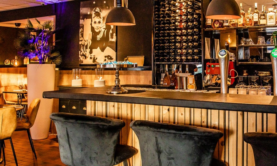 diamanthaas van de grill met Italiaanse pepersaus en zongedroogde tomaatjes, gepocheerde zalm met hollandaisesaus en gegarneerd met rivierkreeft, groene salade met huisgemaakte dressing en verse friet